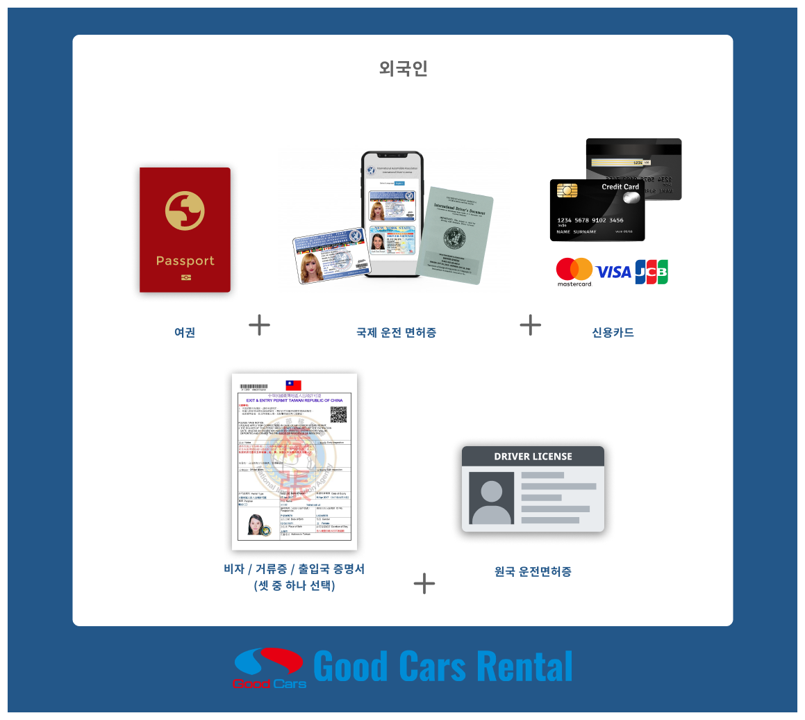 • 국제 운전면허증 (만료일 페이지 및 개인정보 페이지 제공 필수)