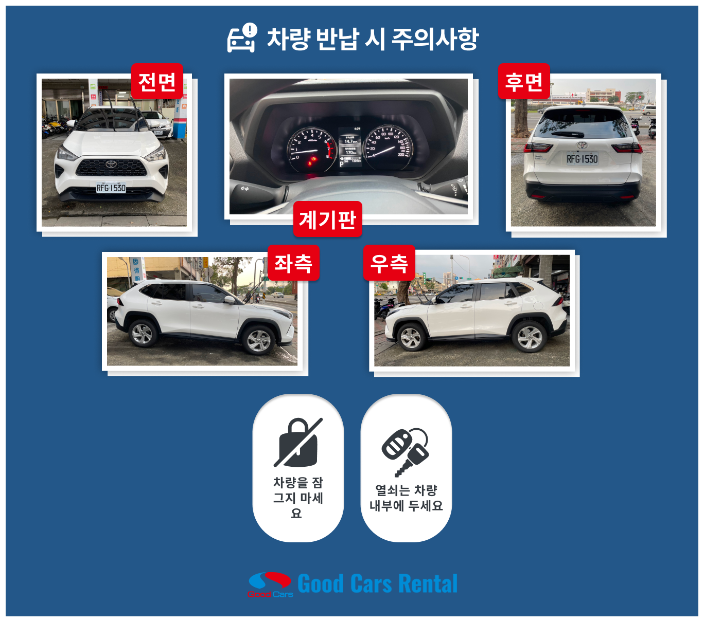 차량에 손상이나 파손이 발견될 시 모든 비용은 대여자가 부담해야 합니다.