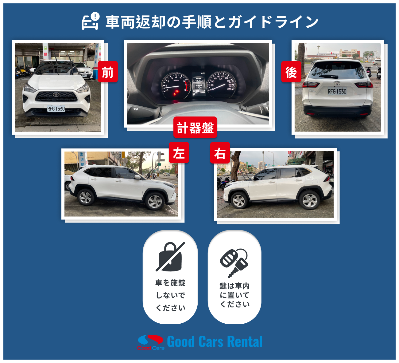 3.鍵の扱い:鍵は車内に置いてください。
