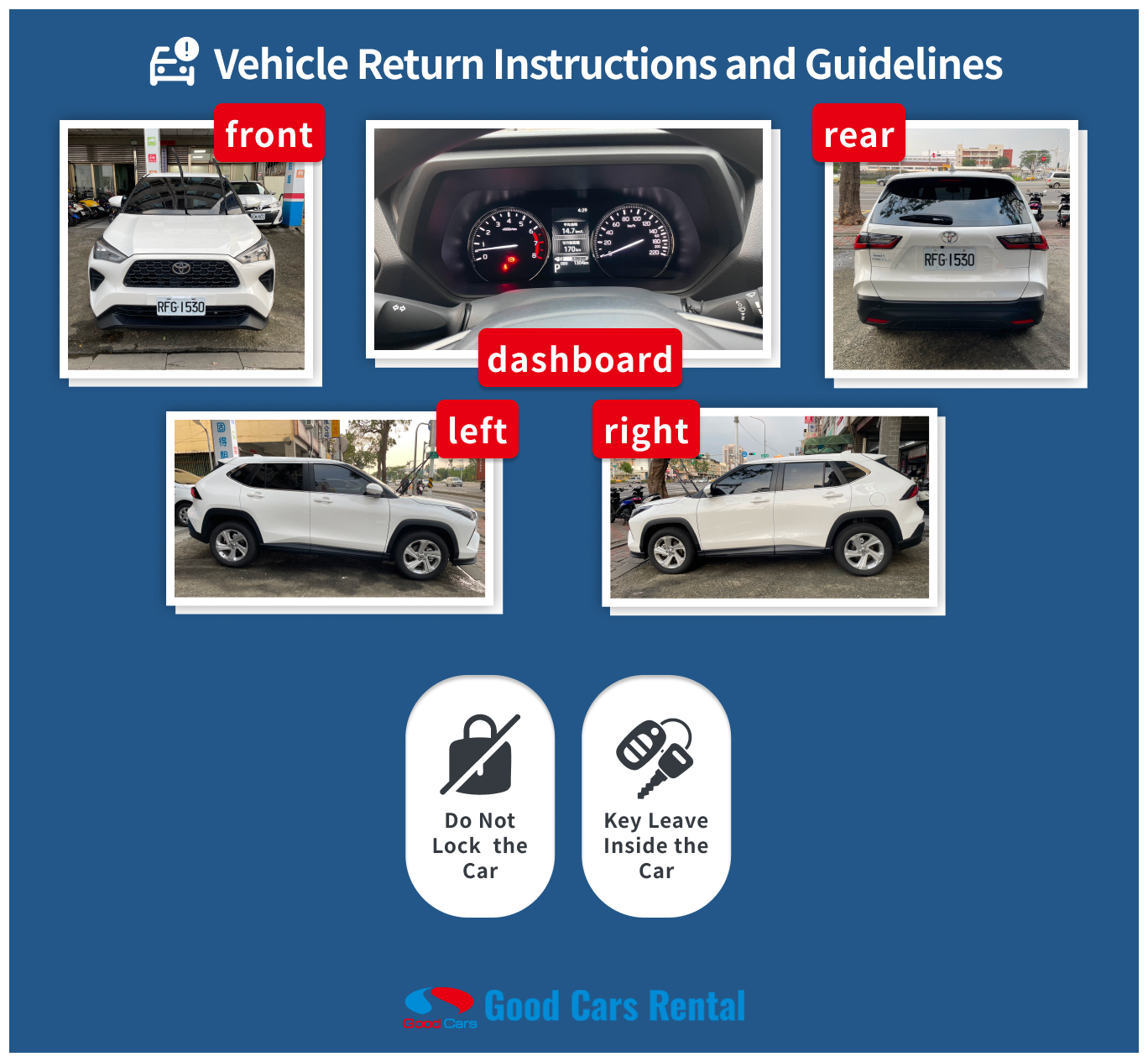 5.我們將會預先透過whatsapp 通知您車輛停車位置,並附上實地照片,鎖匙亦已放於車廂內。